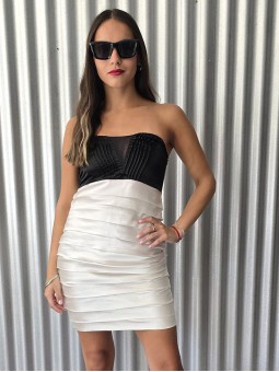Vestido strapples de raso con transparencia en escote. * Consultá las medidas abajo en la descripción.