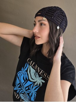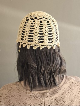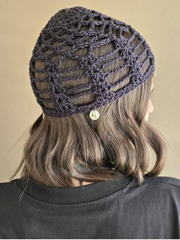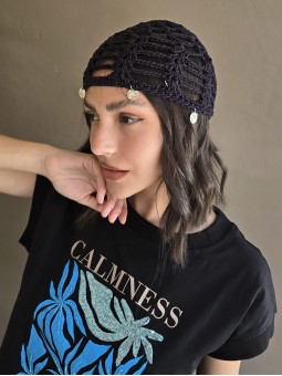 Casquete artesanal tejido a mano en crochet con dijes de moneditas.
