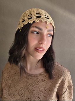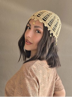 Casquete artesanal tejido a mano en crochet con dijes de estrellitas.