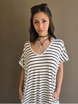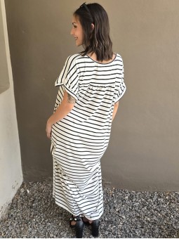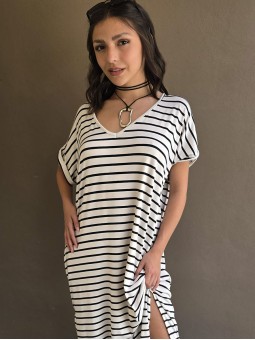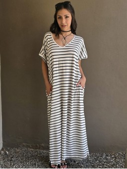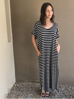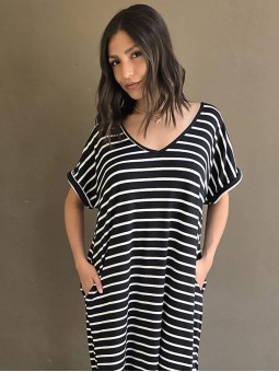 Vestido largo de modal soft, con cuello V y mangas cortas. Corte amplio, oversize, con tajos inferiores y bolsillos. * Consultá las medidas abajo en la descripción.