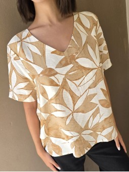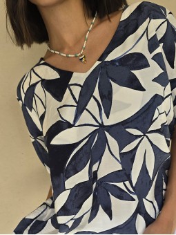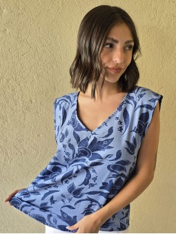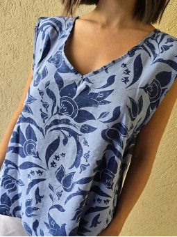Blusa de lino con estampa en azul, con bretel ancho, corte suelto. * Consultá las medidas abajo en la descripción.