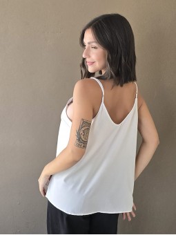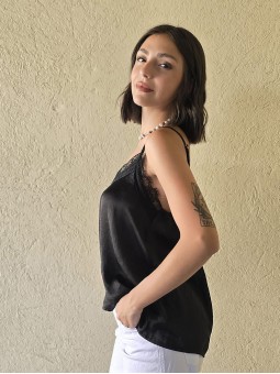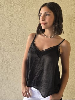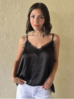 Blusa de satén con puntilla en escote, elastico en espalda y breteles regulables. * Consultá las medidas abajo en la descripción.