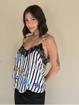 Blusa de fibrana estampada con breteles finos y puntilla en el escote. * Consultá las medidas abajo en la descripción.