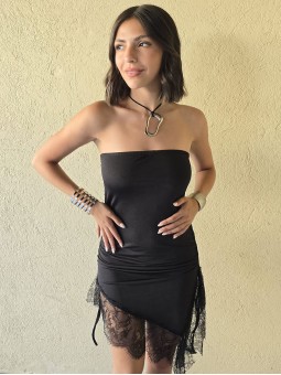 Vestido strapless de microfibra, con ruedo asimetrico y puntilla en inferior. Tiene lazo en costado para regular. * Consultá las medidas abajo en la descripción.