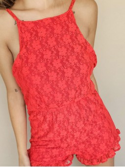 - 15% OFF ABONANDO CON TRANSFERENCIA Mono corto de encaje bordado elastizado con escote cruzado y espalda descubierta. * Consultá las medidas abajo en la descripción.