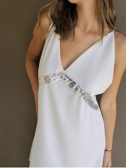 Vestido de crepe con detalle de lentejuelas en el frente y breteles de strass. Tiene viso interno * Consultá las medidas abajo en la descripción.