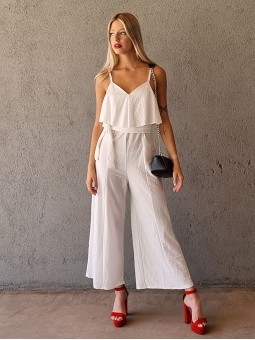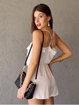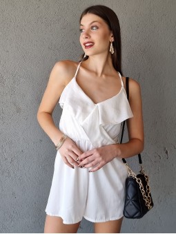 Mono de raso con volado delantero y espalda cruzada. Con elástico en la cintura. * Consultá las medidas abajo en la descripción.
