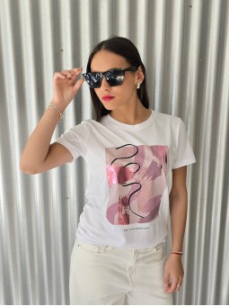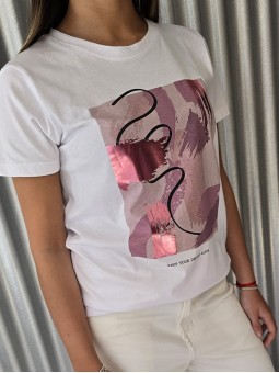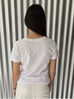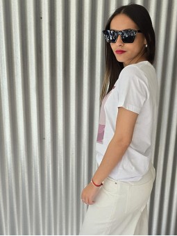 Remera de algodón, cuello V, con estampa en costado delantero. * Consultá las medidas abajo en la descripción.