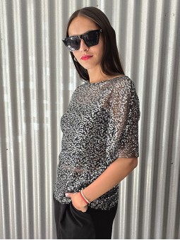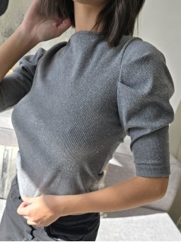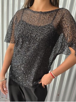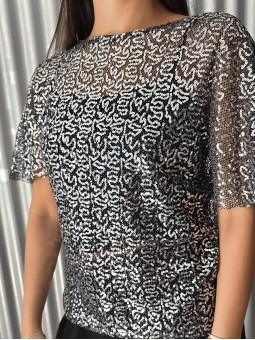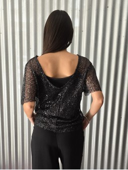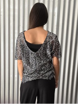 Blusa cuello a la base, de microlentejuelas plata, con escote V posterior. No incluye el top que esta debajo. * Consultá las medidas abajo en la descripción.