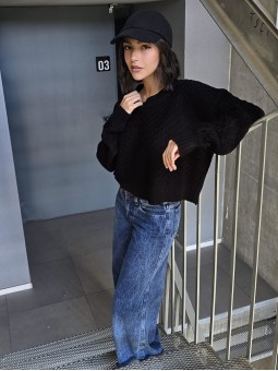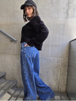 Jean wide leg rigido, con vuelta en botamanga y pespuntes a contratono. *Identificá tu talle en la tabla que figura abajo.