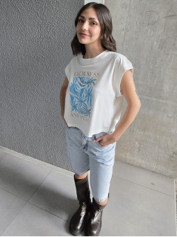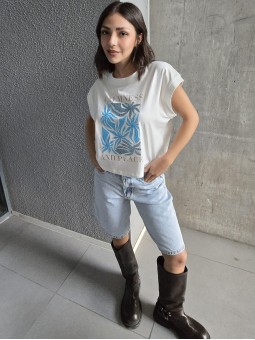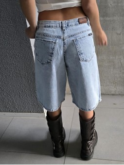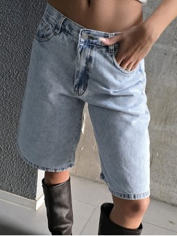 Bermuda de denim rígido con prelavado celeste. *Identificá tu talle en la tabla que figura abajo.