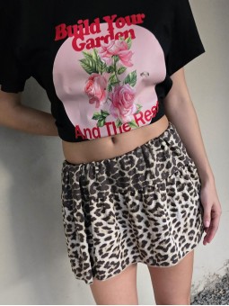 Minifalda de fibrana satinada estampada, con recorte y frunces y elástico en cintura. * Consultá las medidas abajo en la descripción.