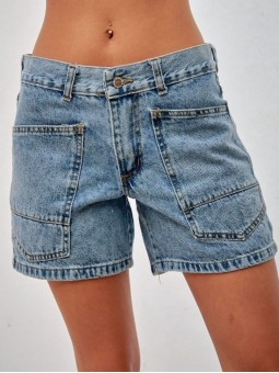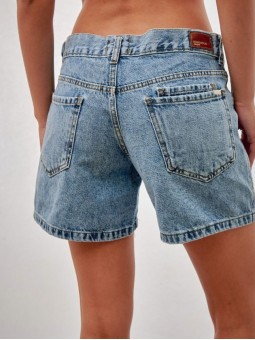 Short bermuda de denim rígido, con bolsillo plaqué. * Identificá tu talle en la tabla que figura abajo en la descripción del producto.