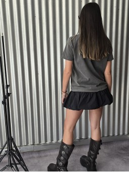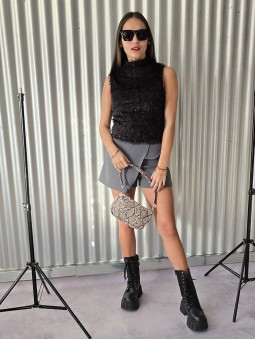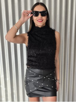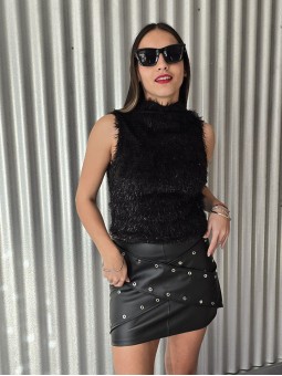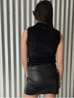 Mini de ecocuero con tiras cruzadas delante. Tiene cierre invisible en parte de atras. * Consultá las medidas abajo en la descripción.