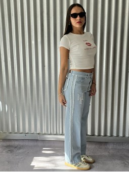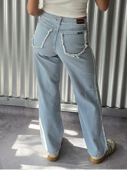 Jean wide leg de denim rígido, con bolsillos y laterales desflecados. *Identificá tu talle en la tabla que figura abajo.