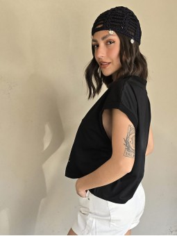 Remera importada, de algodón premium corta, con detalle de strass y perlas en el cuello y pecho. * Consultá las medidas abajo en la descripción.