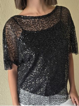 Blusa cuello a la base, de microlentejuelas plata, con escote V posterior. No incluye el top que esta debajo. * Consultá las medidas abajo en la descripción.