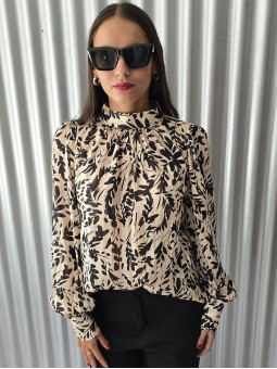 Blusa en crepe traslucido, con cuello alto y apertura en la nuca con botones forrrados. La manga es ancha con puños con botones. * Consultá las medidas abajo en la descripción.