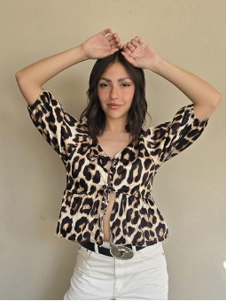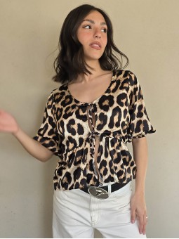 Blusa de seda animal print, con lazos para atar en delantero y manga globo. * Consultá las medidas abajo en la descripción.