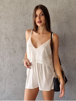 Mono corto de encaje bordado elastizado con escote cruzado y espalda descubierta.