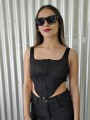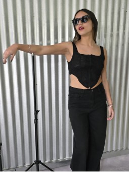 Top de encaje elastizado, con cierre en delantero y corte irregular en el frente.
