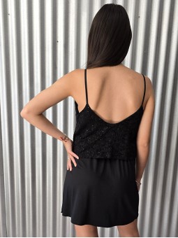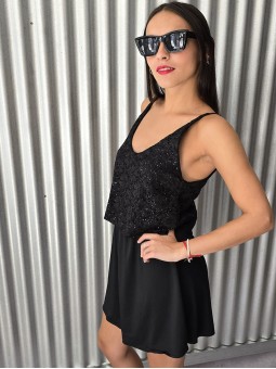 Vestido corto estampado de seda crush, con puntilla en escote y espalda.