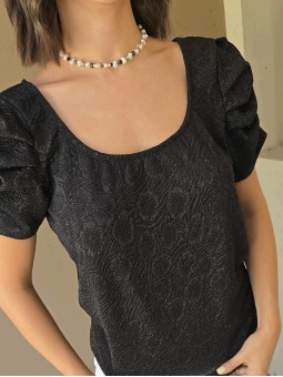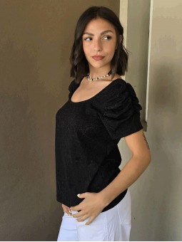 Top de microfibra satinada, con escote buche volcado, doble y embolsado. Espalda semidescubierta con elastico finito para mejor agarre.