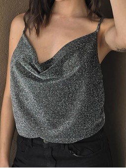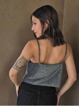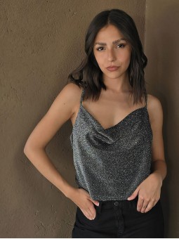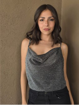 Top de microfibra satinada, con escote buche volcado, doble y embolsado. Espalda semidescubierta con elastico finito para mejor agarre.