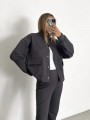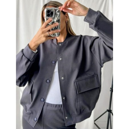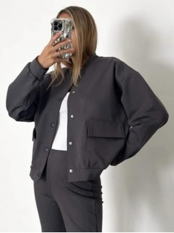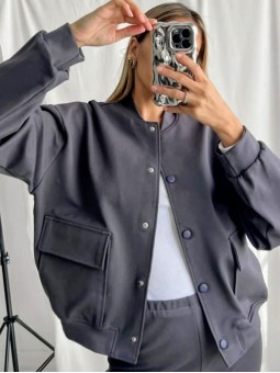 Campera bomber de punto roma rígido, con bolsillos funcionales delanteros y botones de broche presión.