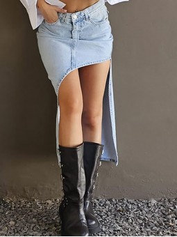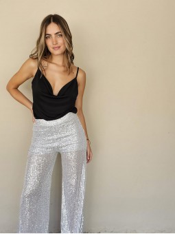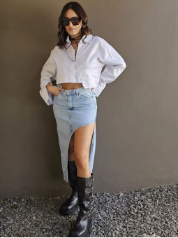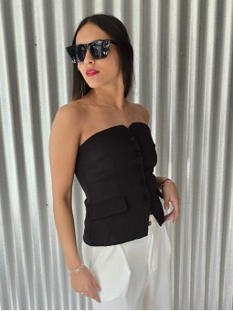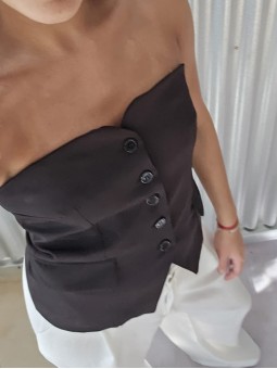 Top de lycra manga larga,con cuello media polera, sustracción gota en el escote, y terminación en pico asimétrico con argollitas.