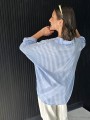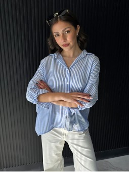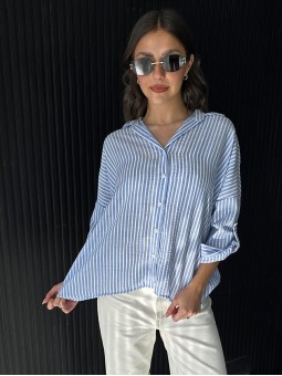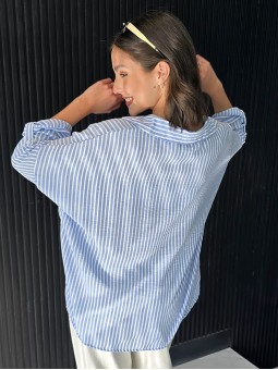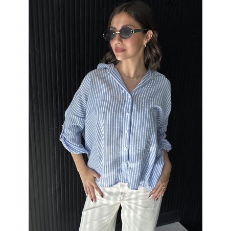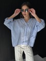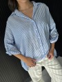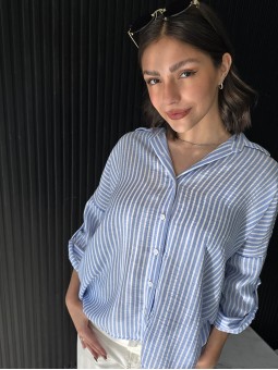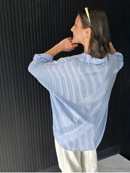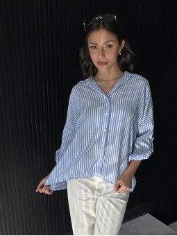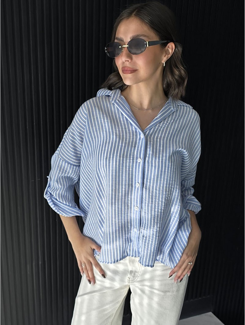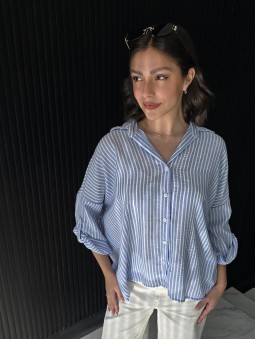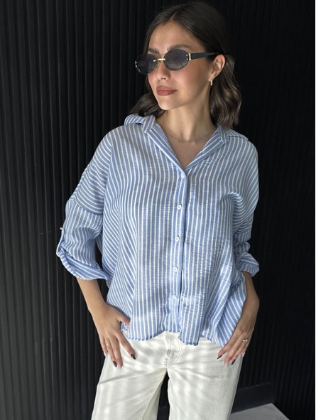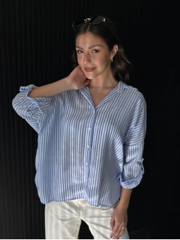 Camisa de lino rayado corte oversize , con manga 3/4 y boton para arremangar.