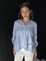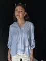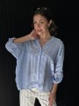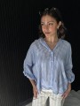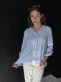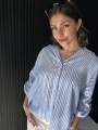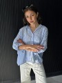 Camisa de lino rayado corte oversize , con manga 3/4 y boton para arremangar. El largo delantero es mas corto que el trasero.