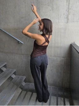 Top de microfibra irregular con detalle de hebilla en el hombro.