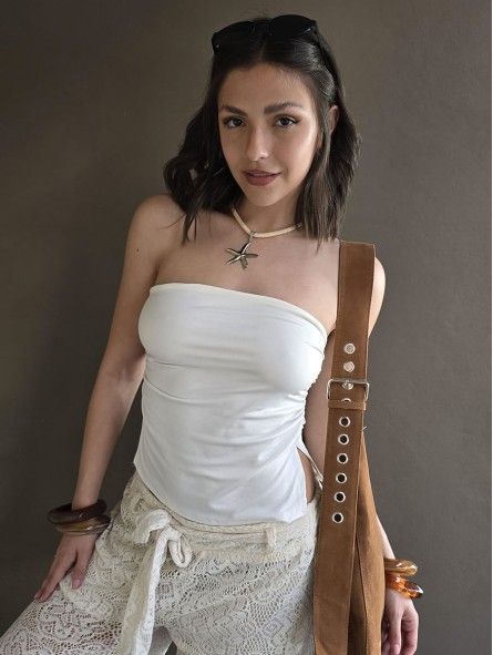 Top strapless de lycra soft con frunce lateral y tajo.