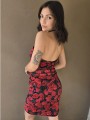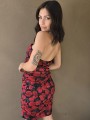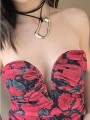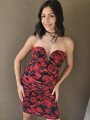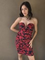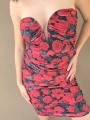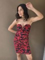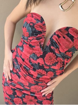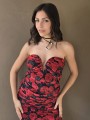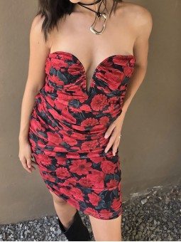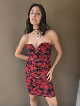 Vestido de tul estampado, con forreria y drapeado. Tiene escote corazon con ballena interna que le da forma.