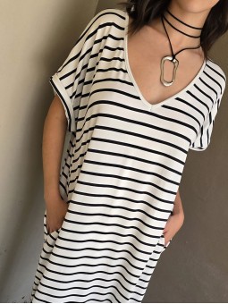 Vestido largo de modal soft, con cuello V y mangas cortas. Corte amplio, oversize, con tajos inferiores y bolsillos.