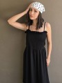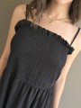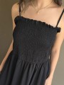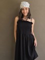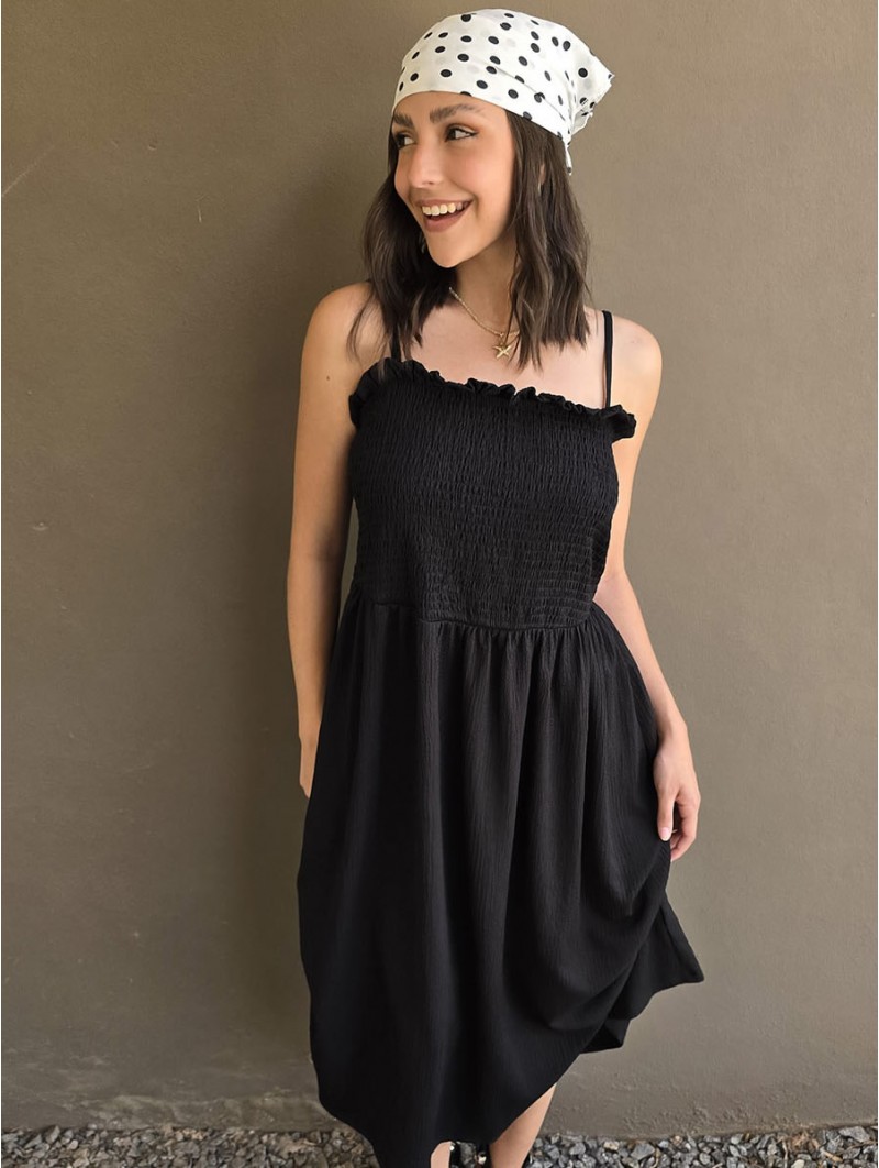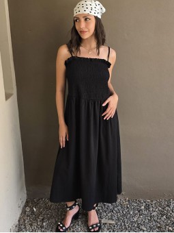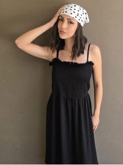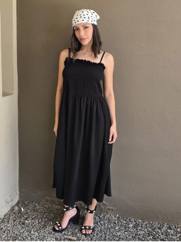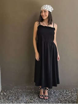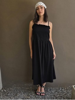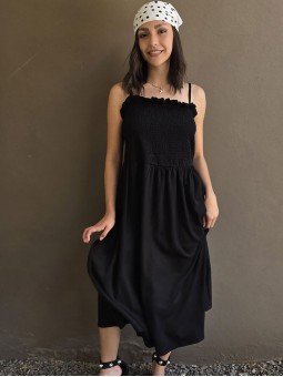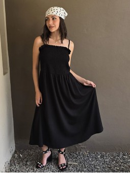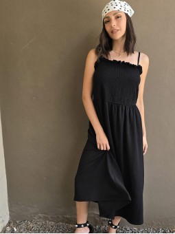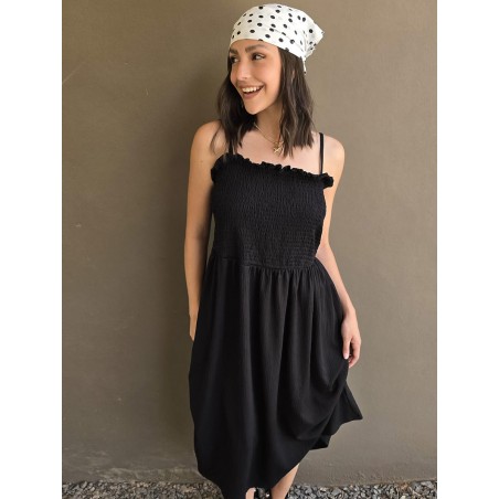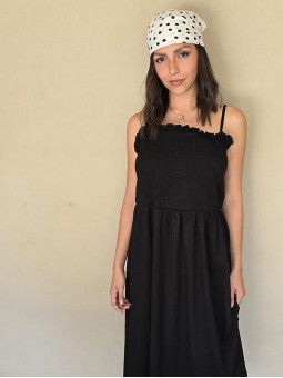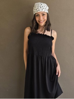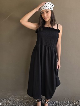 Vestido en crepe de bambula, con breteles finos ajustables y bustier panal de abeja elastizado. Con ribete en el escote.