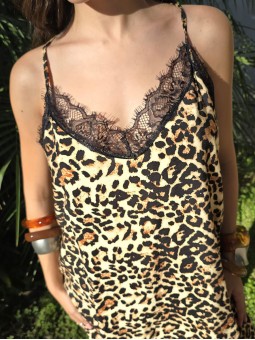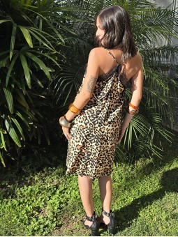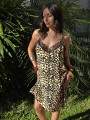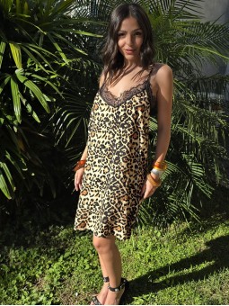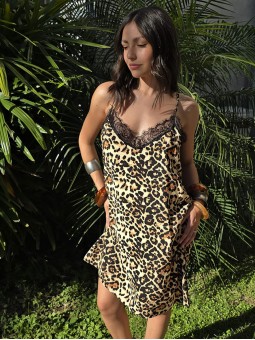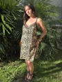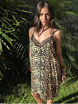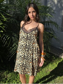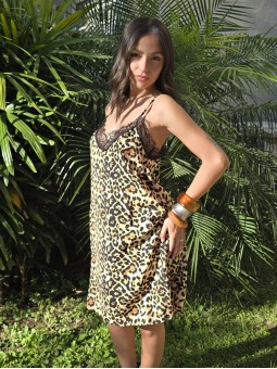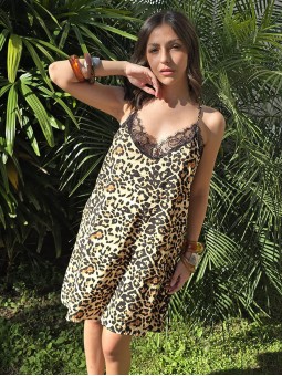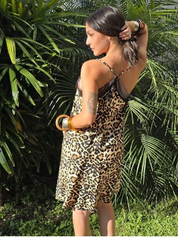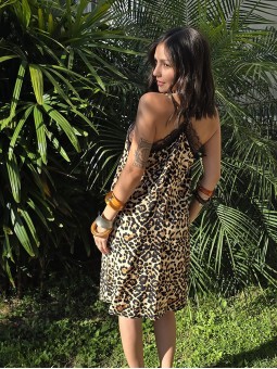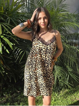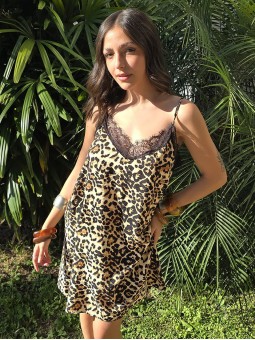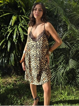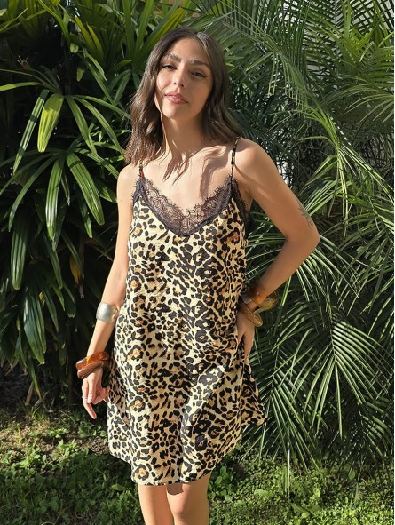 Vestido corto estampado de seda crush, con puntilla en escote y espalda.