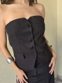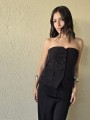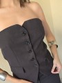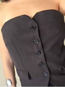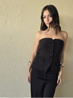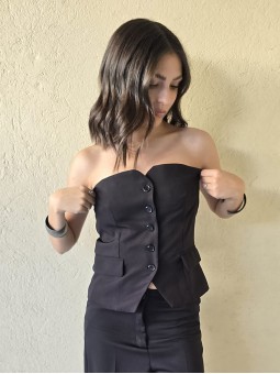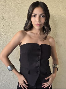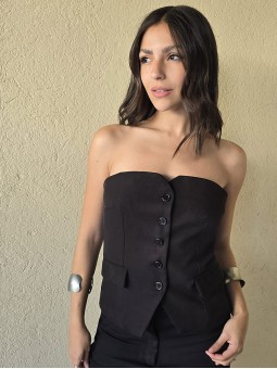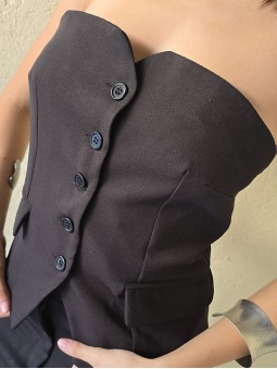 Top sastrero de crepe con forrería interna. Cruzado con 5 botones, pinza de entalle y de busto. Tiene bolsillos ojal con tapa.
