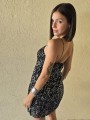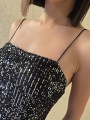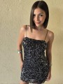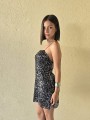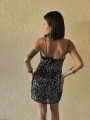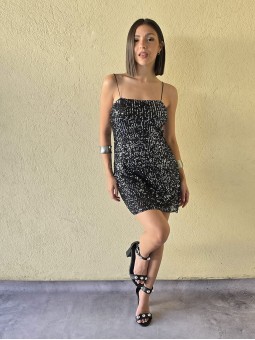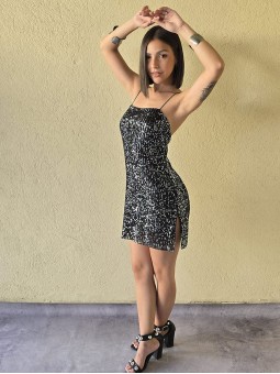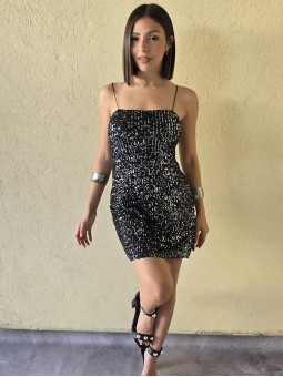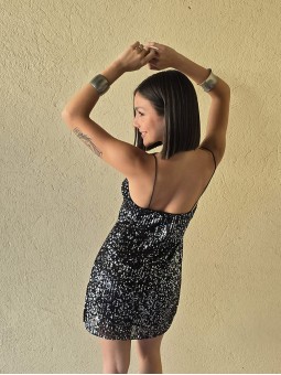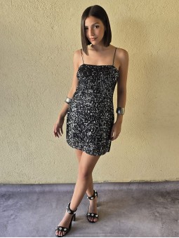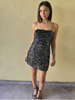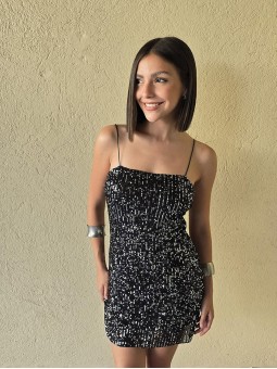 Vestido de microlentejuelas plata y negro, con breteteles elasticos y tajo en ruedo.