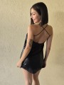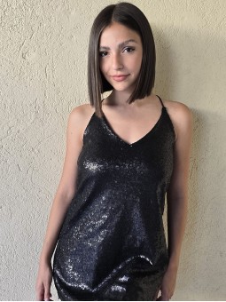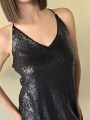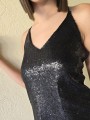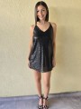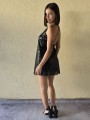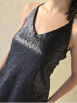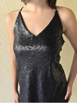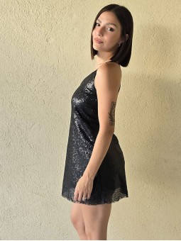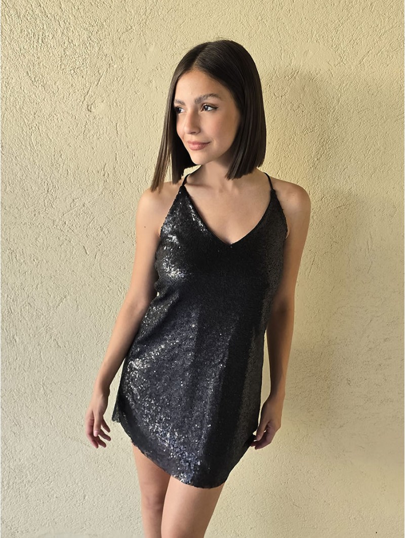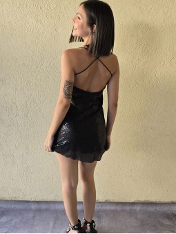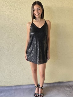 Vestido corto de micro lentejuelas opacas bordadas. Con viso interno y espalda con tiras elastizadas cruzadas.