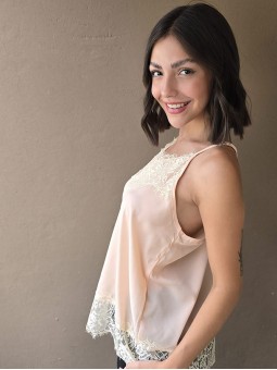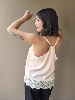 Blusa de saten opaco, con puntilla en escote y ruedo, y breteles regulables.