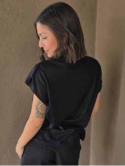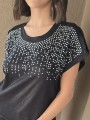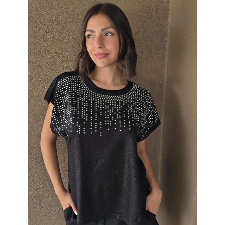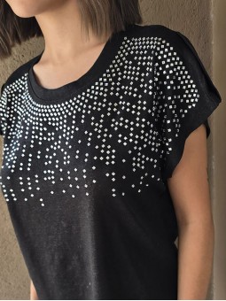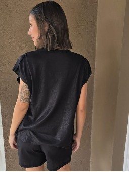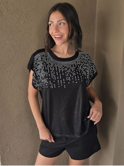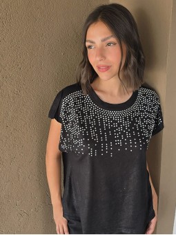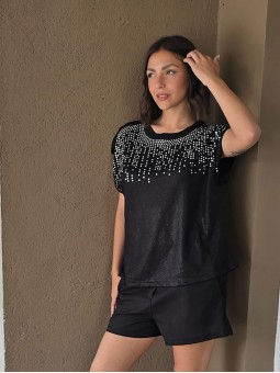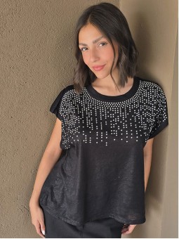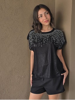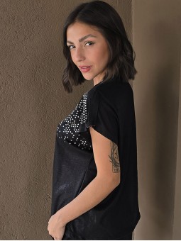 Remera manga corta, de flame foil con hot fix en delantero y detalle de tira en hombro.