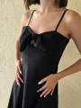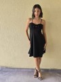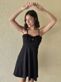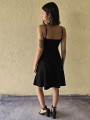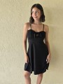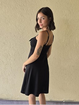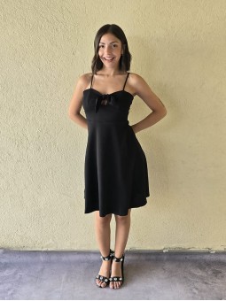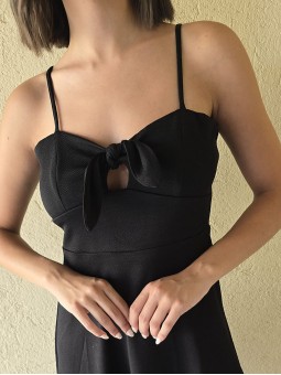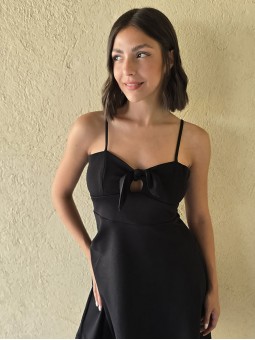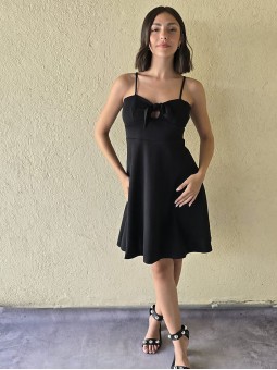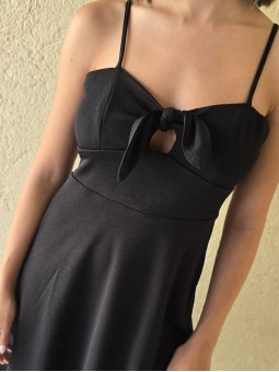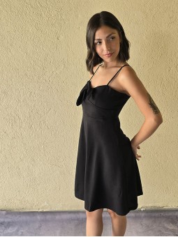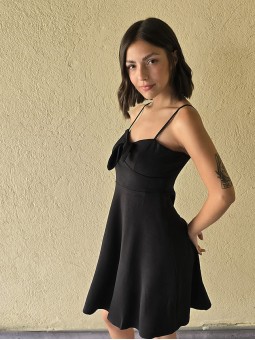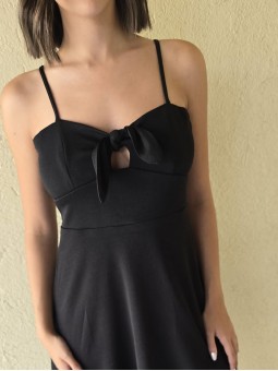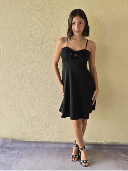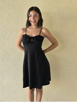 Vestido de crepe elastizado, con corte evasé y detalle de nudo en escote.