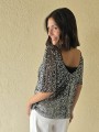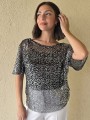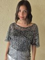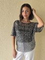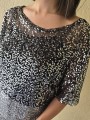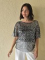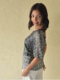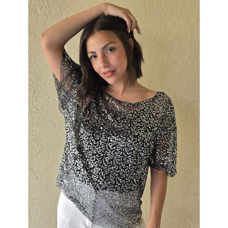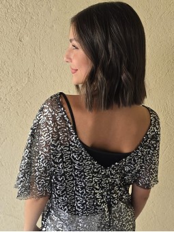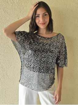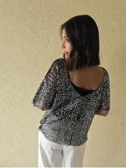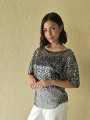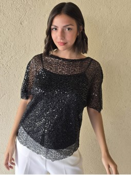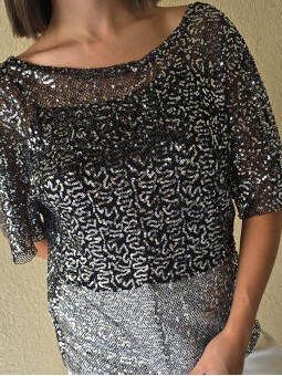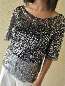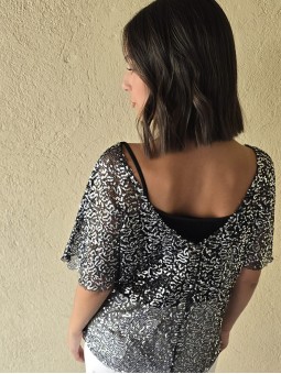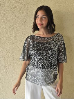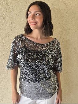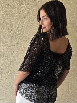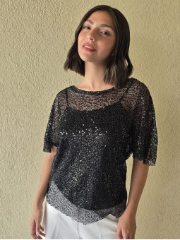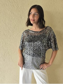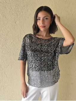 Blusa cuello a la base, de microlentejuelas plata, con escote V posterior. No incluye el top que esta debajo.