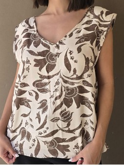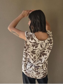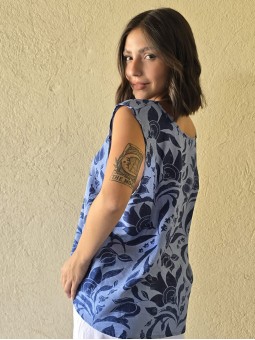Blusa de lino con estampa en azul, con bretel ancho, corte suelto.