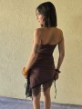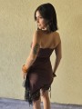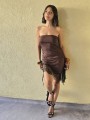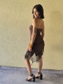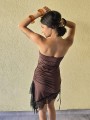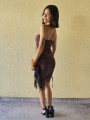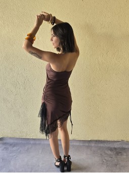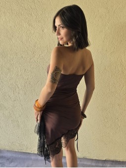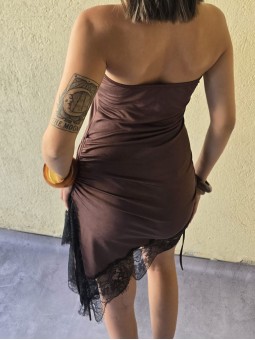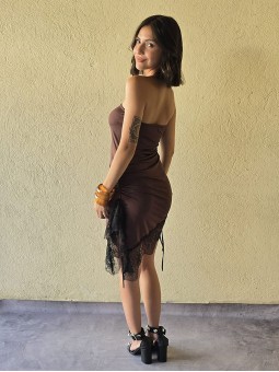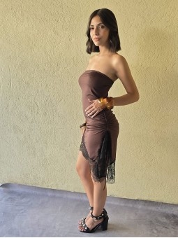 Vestido strapless de microfibra, con ruedo asimetrico y puntilla en inferior. Tiene lazo en costado para regular.