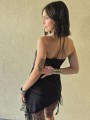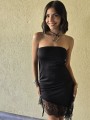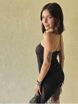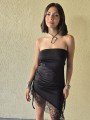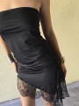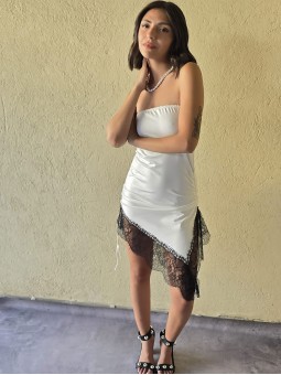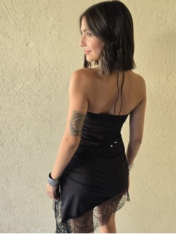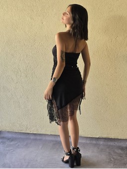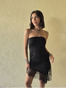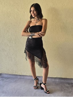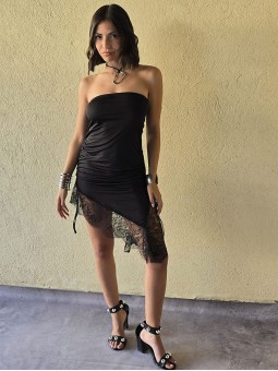 Vestido strapless de microfibra, con ruedo asimetrico y puntilla en inferior. Tiene lazo en costado para regular.