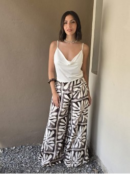 Blusa lencera de crepe con breteles finos y puntilla en el escote.