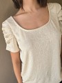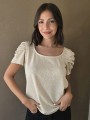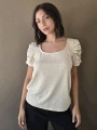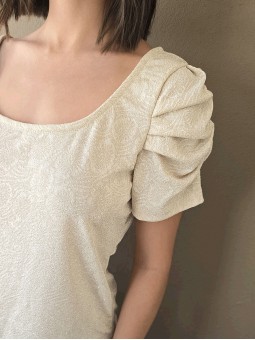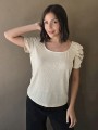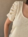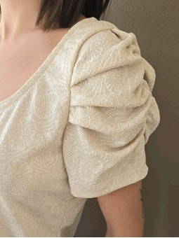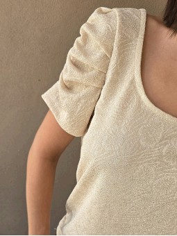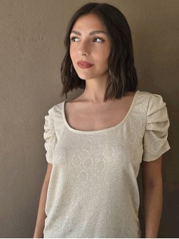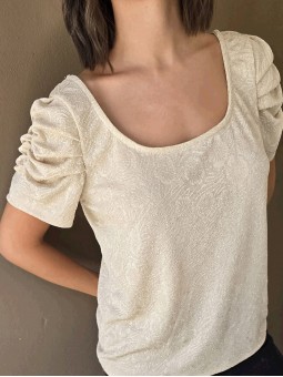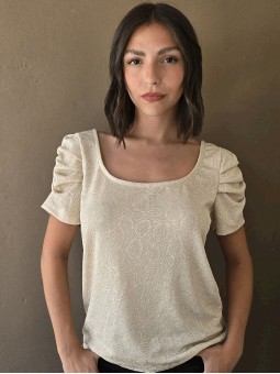 Blusa de punto lurex elastizado, con cuello y espalda en U, con detalle de frunce en mangas.
